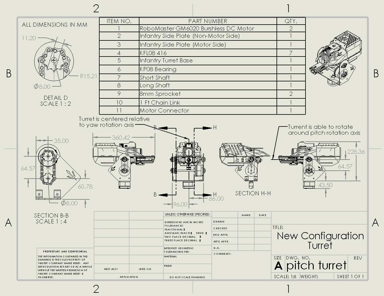 I started brainstorming rotary to rotary motion mechanisms. I first looked into 4-bar parallelogram linkages since it was a simple mechanism, but I was worried about how structurally stable it would be and the possibility of the deadlocking when the linkages were parallel. I then looked into belt drives, chain drives, and gear drives. I made a pros and cons list and ultimately, I ended up deciding to use a chain drive because of cost and that it would save the most space. The distance between the driving and driven shaft was too far apart and would result in using many gears. The mechanism would have to be bidirectional so the turret could pitch forward and backward. I didn’t have any experience with belt drives and was worried that there would be too much slack and it could only rotate in one direction. Throughout the process, I also checked relative drive prices on MISUMI USA, McMaster-Carr, and Amazon since price was a huge factor in determining what mechanism to use. My list of pros and cons can be viewed here.